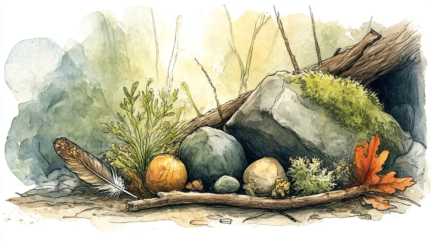 We start decorating a clearing. We’ve been walking along a mountain trail near Asheville, collecting nature’s treasures: a feather; a rock I love for its shape and texture; an interesting stick; enchanted lichen.
