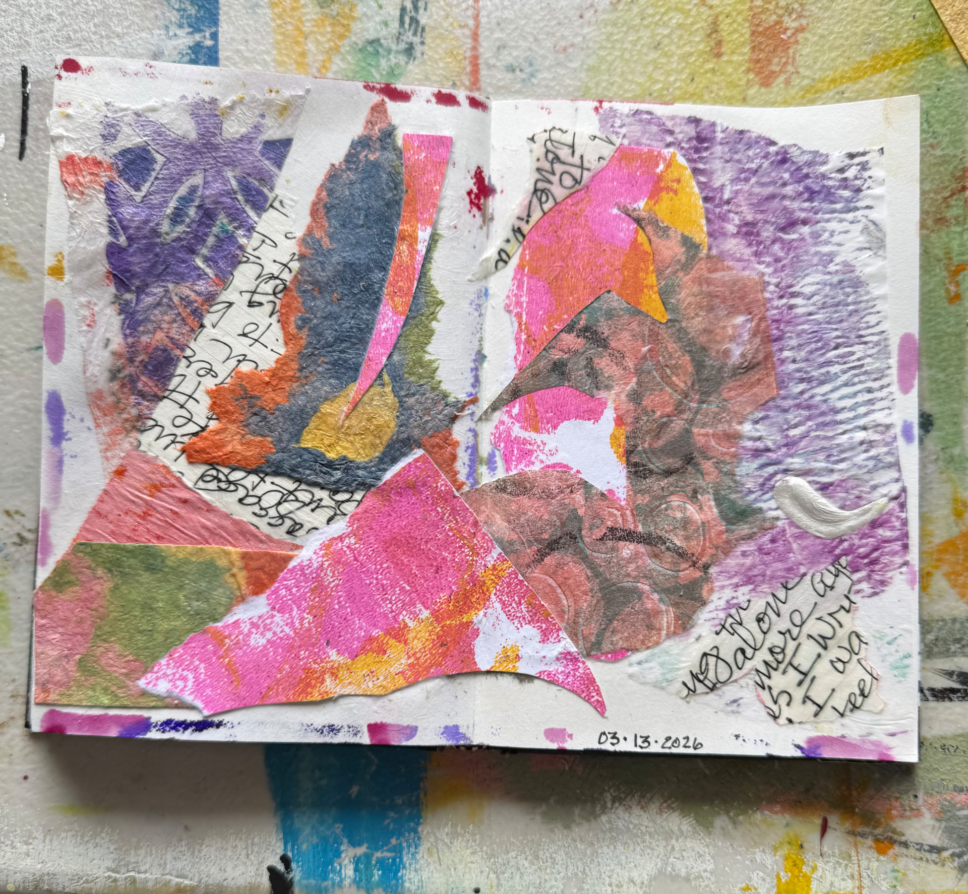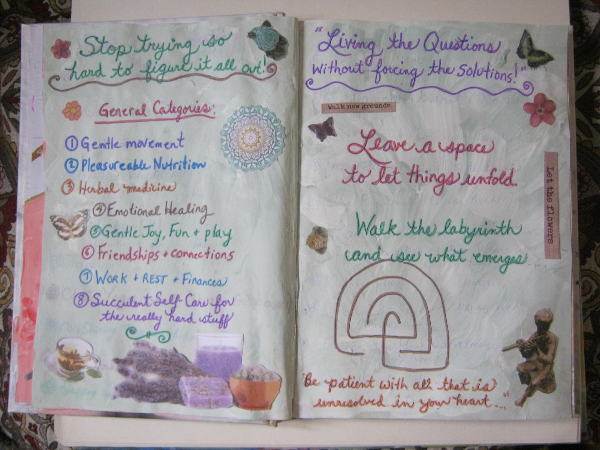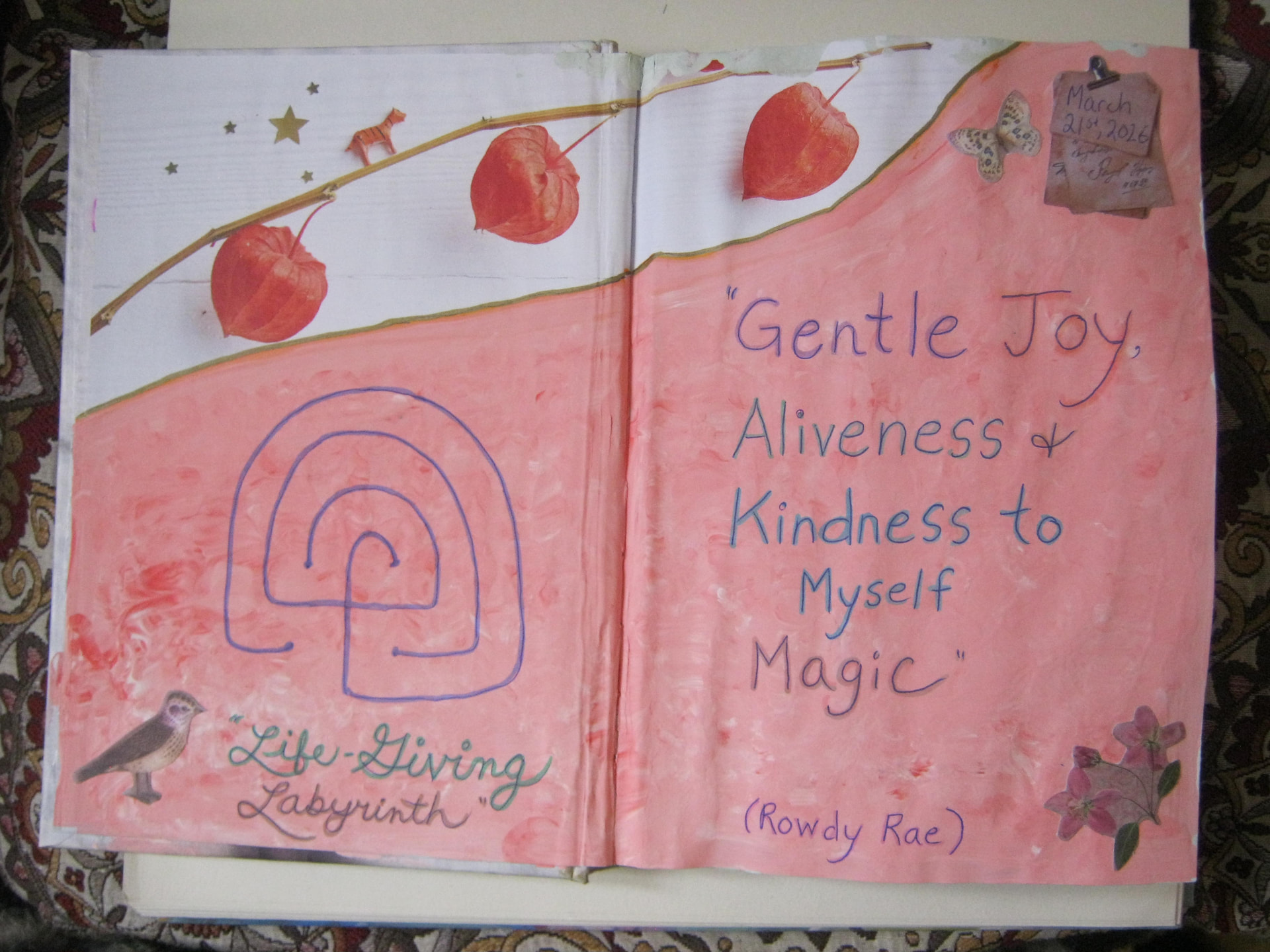 Lovely entries in your altered book; kind and gentle words and symbols. If I may suggest, try not to rip out your “frustrated” pages; they will remind you of where you were and where you are going. I hope that makes sense.