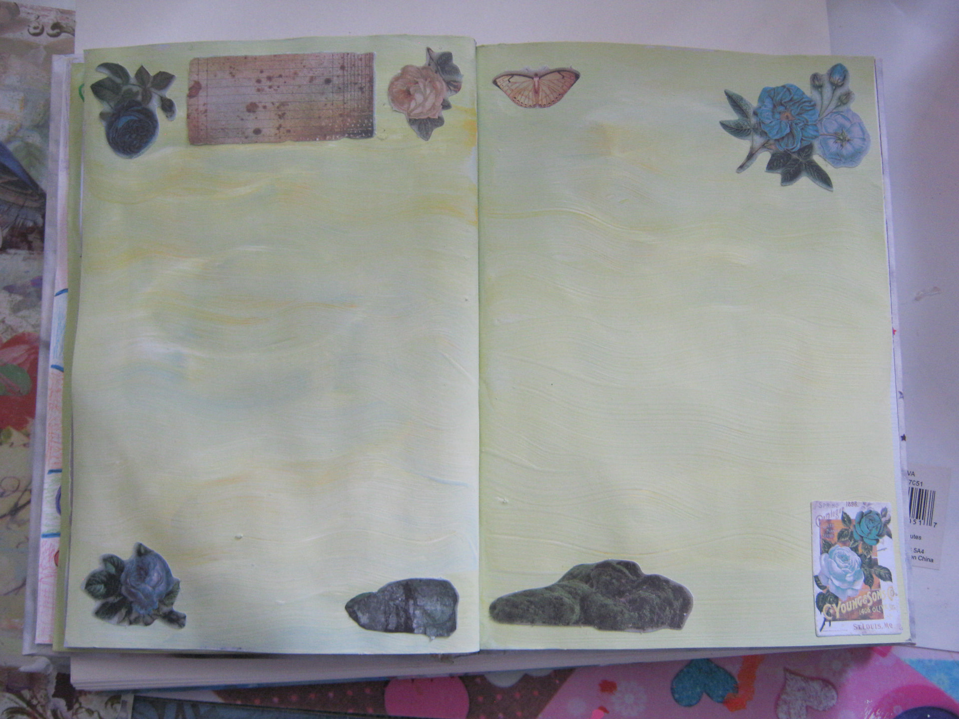 I did abit of playing in my altered book. Actually, last week I got frustrated and ripped out the pages I had started with, and “began again.” Something about my tendency to over-think things and make them more complicated than they need to be was bugging me, so here is my second attempt…
