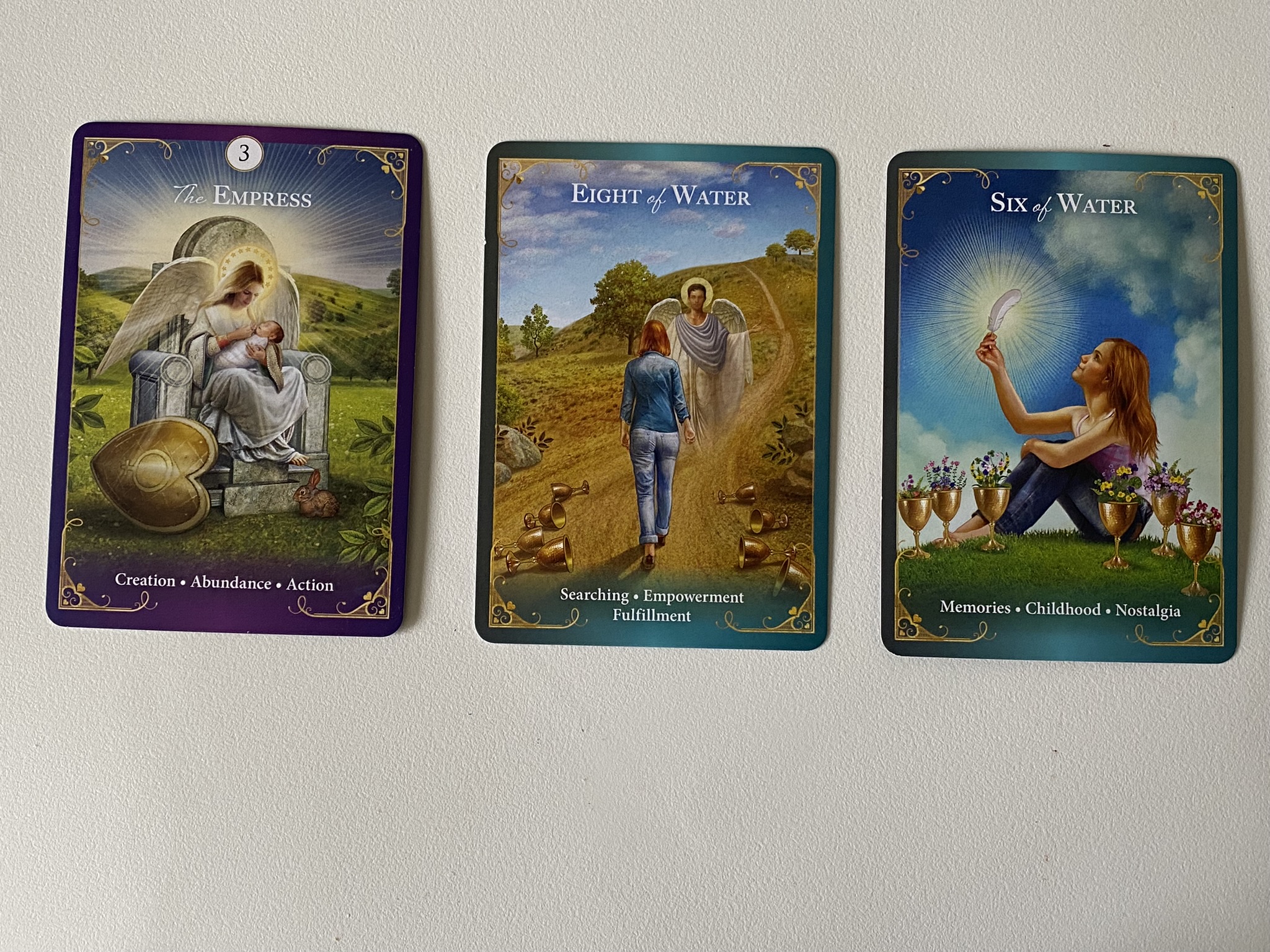 The cards are Guardian Angel Messages Tarot by Radleigh Valentine.