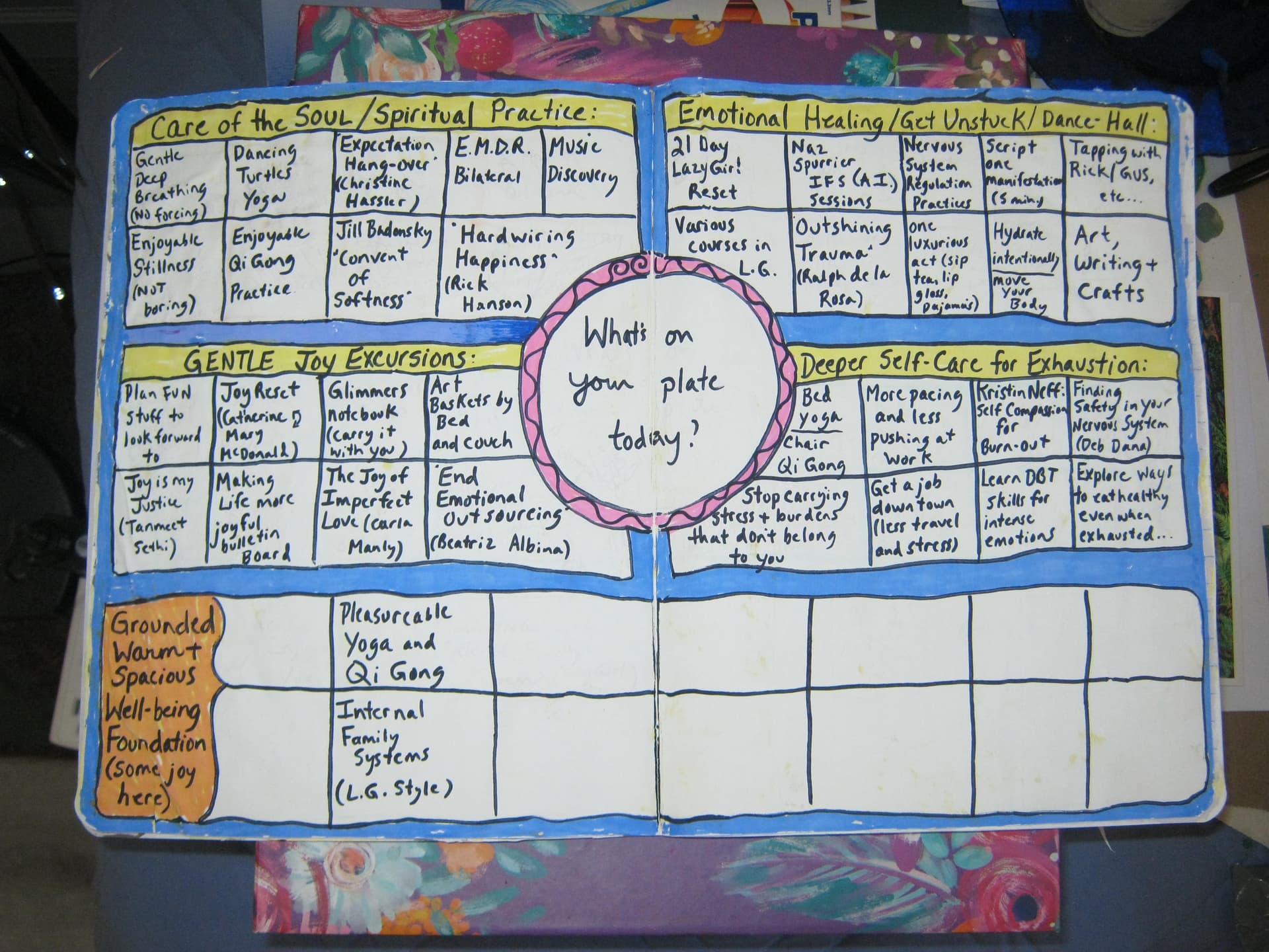 Almost done my 21 Day “Vision Quest” (just a few more days left). Came up with this chart with various tools & choices under 4 main categories (I like having a smorgasbord of choices / variety). The general idea is to stop trying so hard to “get rid of chronic fatigue” and to focus on finding ways to have more joy and well-being now even with chronic illness. The bottom section of the chart is something I will fill in over the next 3 months or so - just letting it unfold as I learn and practice with these deeper self-care options.