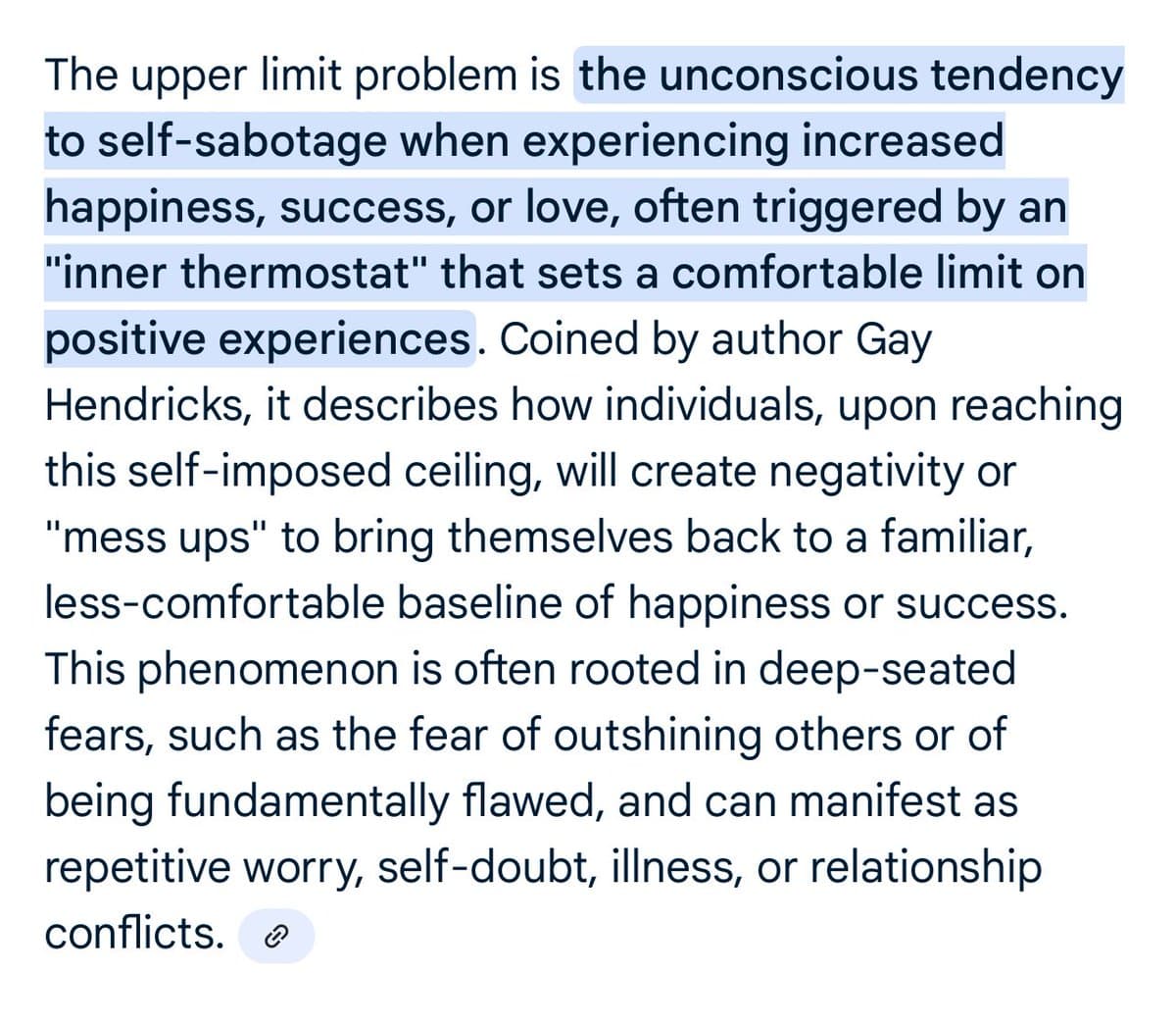 The upper limit problem is the unconscious tendency to self-sabotage when experiencing increased happiness, success, or love, often triggered by an “inner thermostat” that sets a comfortable limit on positive experiences.