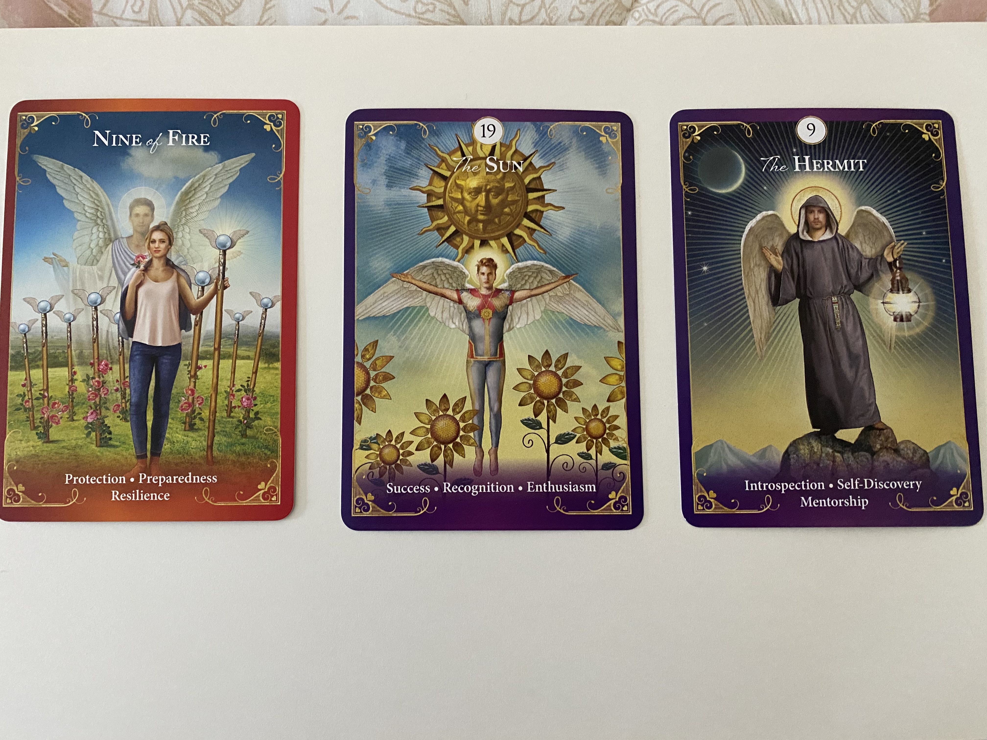 The Hermit is the third card on the right. The angel message here is, “We love helping you, but we also know the power of having a human guide.