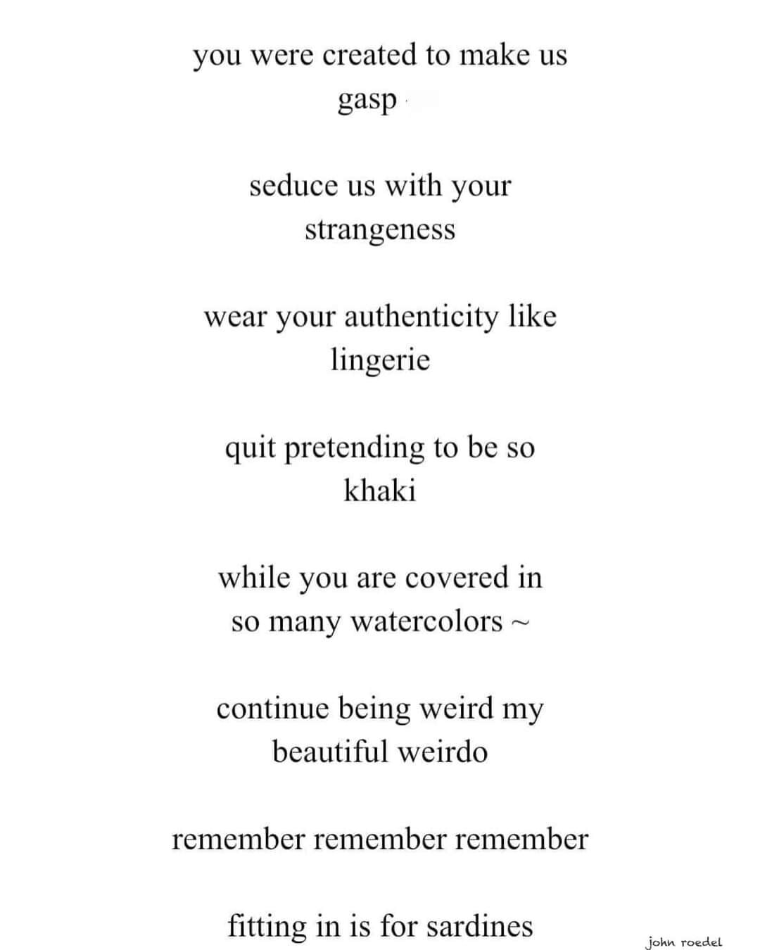 I embrace and celebrate weirdness…weirdness and humour are the antidotes to life when it becomes poisonously boring and predictable. Weird people are my people!!