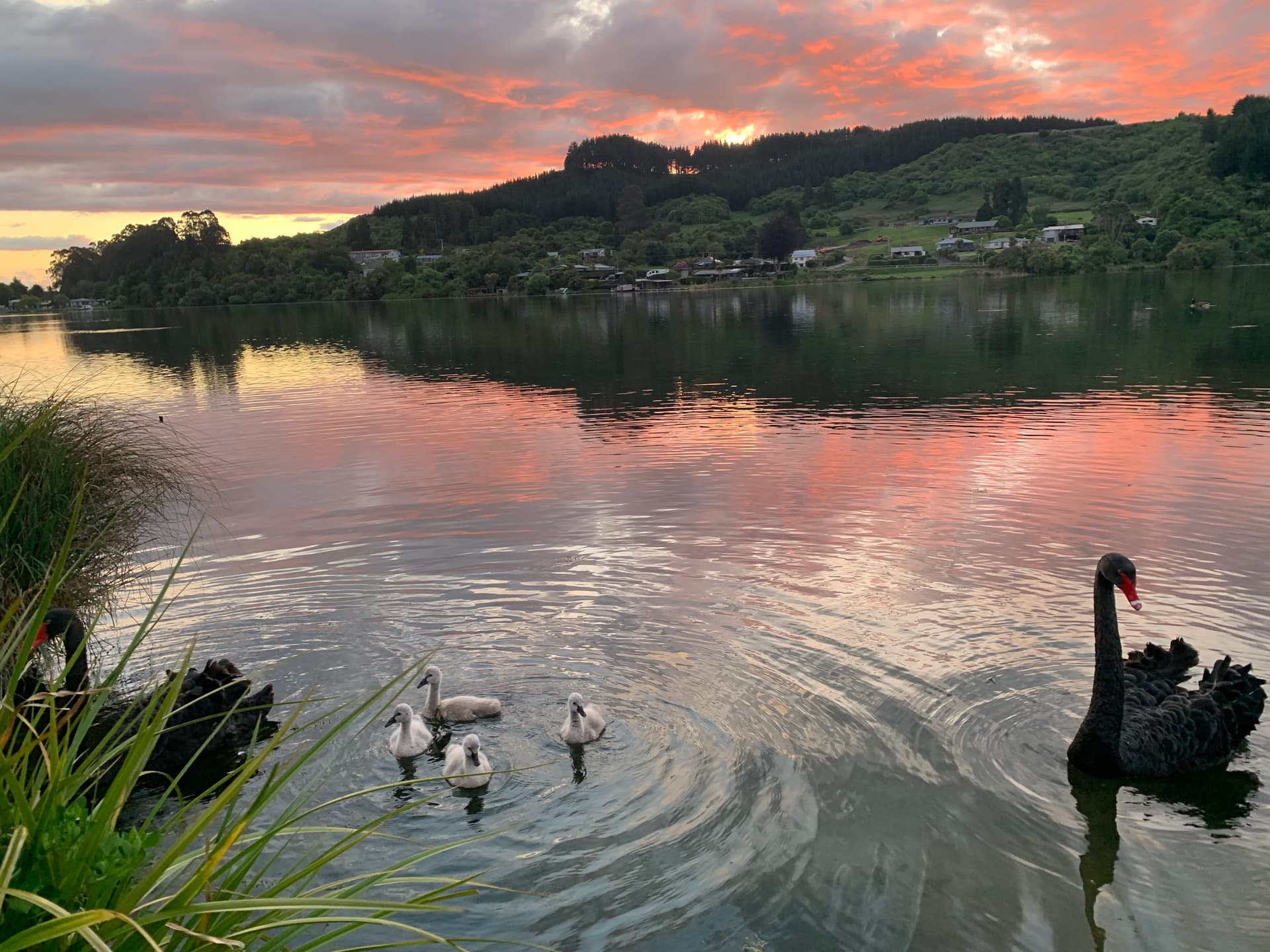 Love these gorgeous swans & the landscape and sunset too.